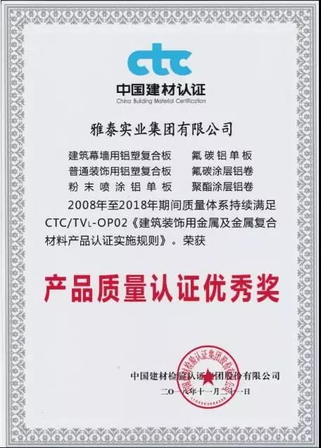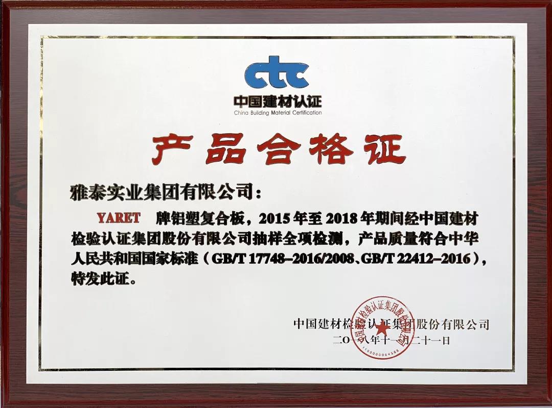 會上,雅泰產(chǎn)品憑借2008年至今2018年期間質(zhì)量體系持續(xù)滿足CTC/TVL-OP02《建筑裝飾用金屬及金屬復合材料產(chǎn)品認證實施規(guī)則》,榮獲2018年度CTC產(chǎn)品質(zhì)量認證優(yōu)秀獎。YARET牌鋁塑復合板,2015年至2018年期間經(jīng)中國建材檢驗認證集團股份有限公司抽樣全項檢測,產(chǎn)品質(zhì)量符合中華人民共和國國家標準(GB/T 17748-2016/2008、GB/T22412-2016),被授予2018年度產(chǎn)品合格證。