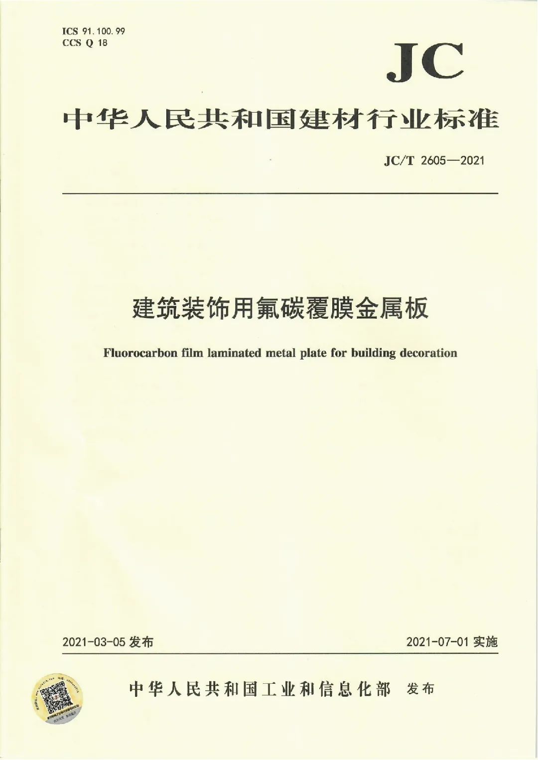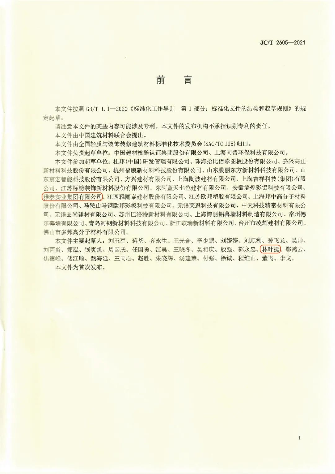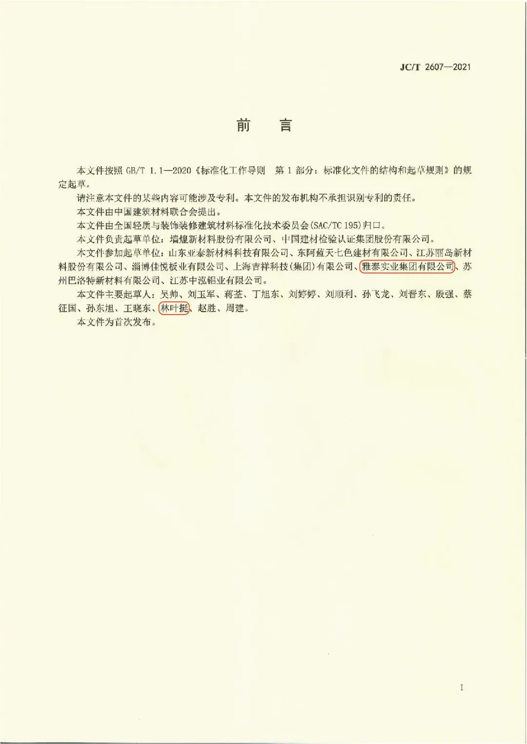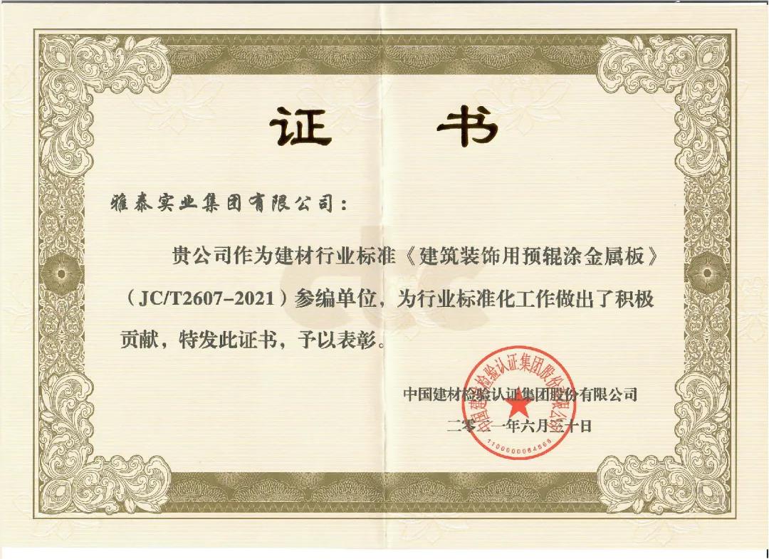 近日,由中國(guó)建筑材料聯(lián)合會(huì)提出,雅泰實(shí)業(yè)集團(tuán)參與起草的《JC/T2605-2021建筑裝飾用氟碳覆膜金屬板》、《JC/T2607-2021建筑屋面用預(yù)輥涂金屬板》兩項(xiàng)行業(yè)標(biāo)準(zhǔn)于2021年3月5日發(fā)布,同年7月1日正式實(shí)施,公司技術(shù)部經(jīng)理林葉挺為此次兩項(xiàng)行業(yè)標(biāo)準(zhǔn)的主要起草人之一。