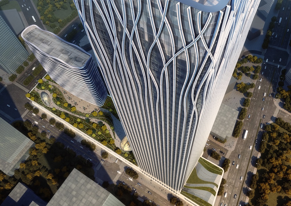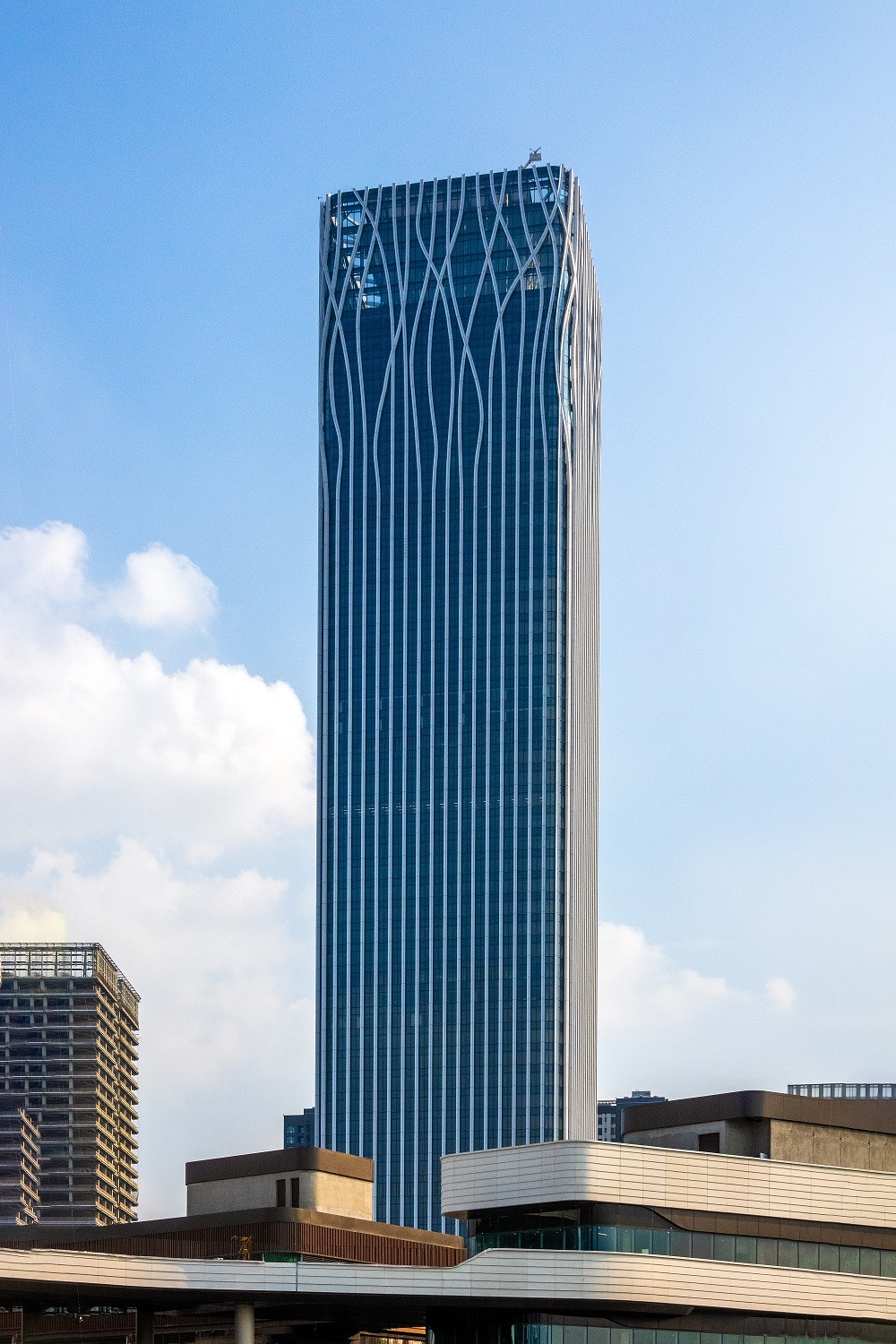 設計大師“樹”的設計理念突出體現(xiàn)在外立面幕墻。鋁幕線條從6層開始齊頭并進直至215米處,之后線條開始不規(guī)則地“開枝散葉”,使得前灘中心看起來更為靈動、生機勃勃。