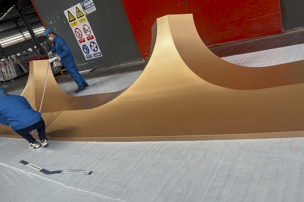 在華為練秋湖研發(fā)中心,為了研發(fā)人員有一個(gè)非常輕松愜意的工作與科創(chuàng)環(huán)境,每一個(gè)組團(tuán)、每一棟單體都因各自功能性不同而被賦予不同的造型,所以幕墻的樣式也比較豐富。同時(shí)每一棟單體特色都以大板、大弧度的形式進(jìn)行單獨(dú)或拼接展現(xiàn),對(duì)于加工技術(shù)以及加工廠要求都比較高。為配合設(shè)計(jì)要求,雅泰集團(tuán)積極開展項(xiàng)目專攻、技術(shù)探討、工藝培訓(xùn),大大提升了鋁幕墻板件的成型度和美觀性。